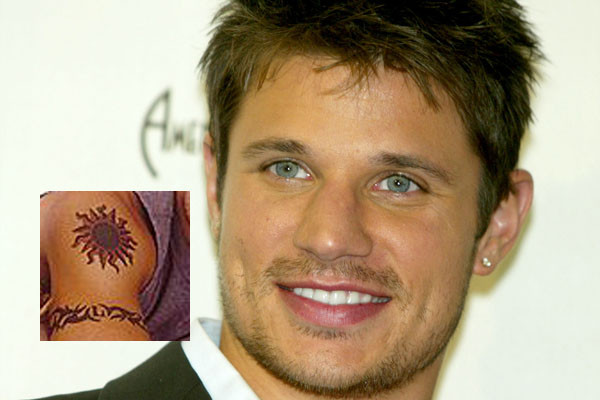 Nick Lachey has three confirmed tattoos on his body, including a tribal armband around his right bicep, a tribal inspired phoenix on his upper back, and finally a large sun with the 98° group logo in the middle, however he has since added color to the sun and covered up the 98°.